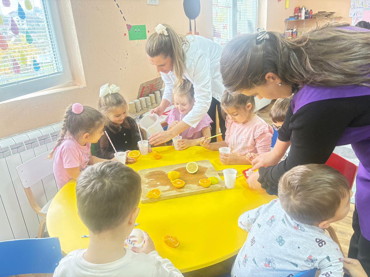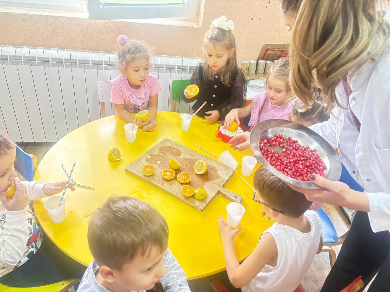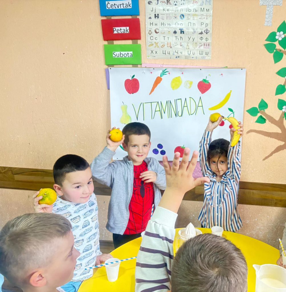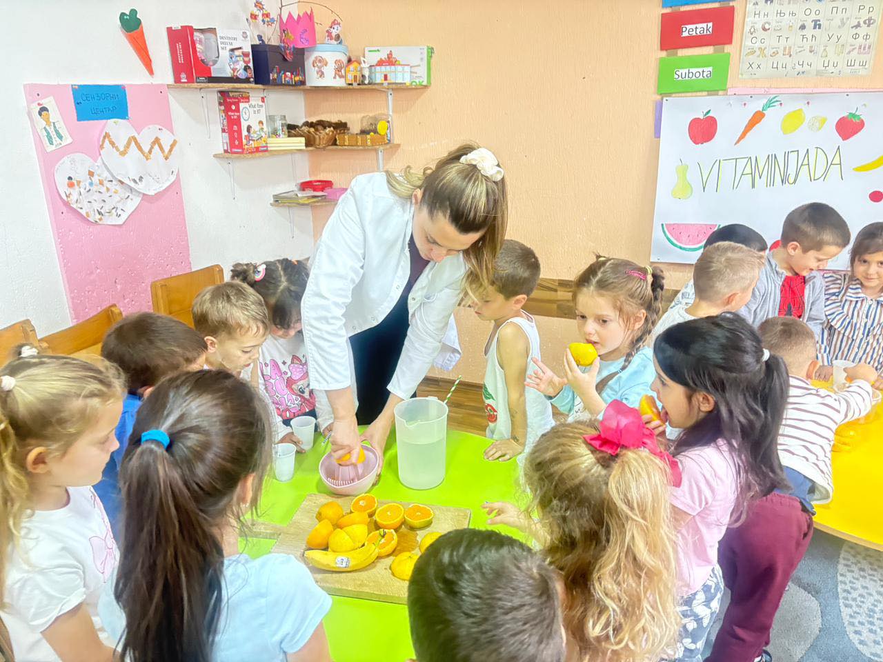 Kroz zanimljive aktivnosti i degustaciju svježih namirnica, predškolci su otkrivali koje vitamine kriju omiljene voćke i zašto je važno svakog dana jesti raznovrsno i zdravo.